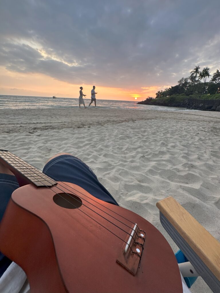 We completely lucked out and immediately got one of the limited parking spots at Mauna Kea, so we drove up and hung out the whole day. The resort fronts a lovely little bay with decent snorkeling on the rock sides and platforms to swim out to. We were really proud of Marielle who swam out to one of the platforms with us. River had the ukulele in his hands pretty much the entire trip, so we ate at the resort restaurant and explored the grounds and played in the sand and swam and snorkeled and waited for dark.