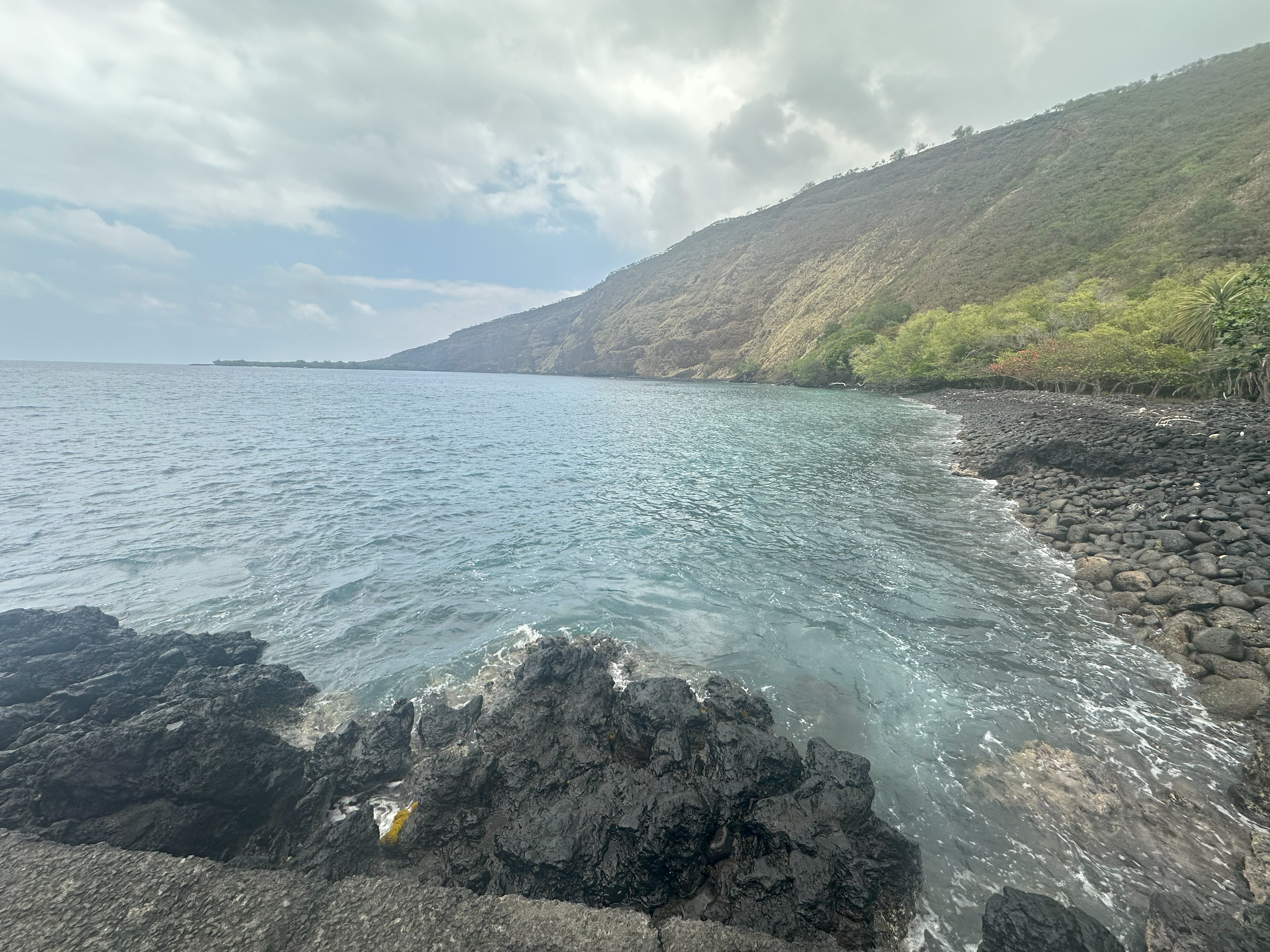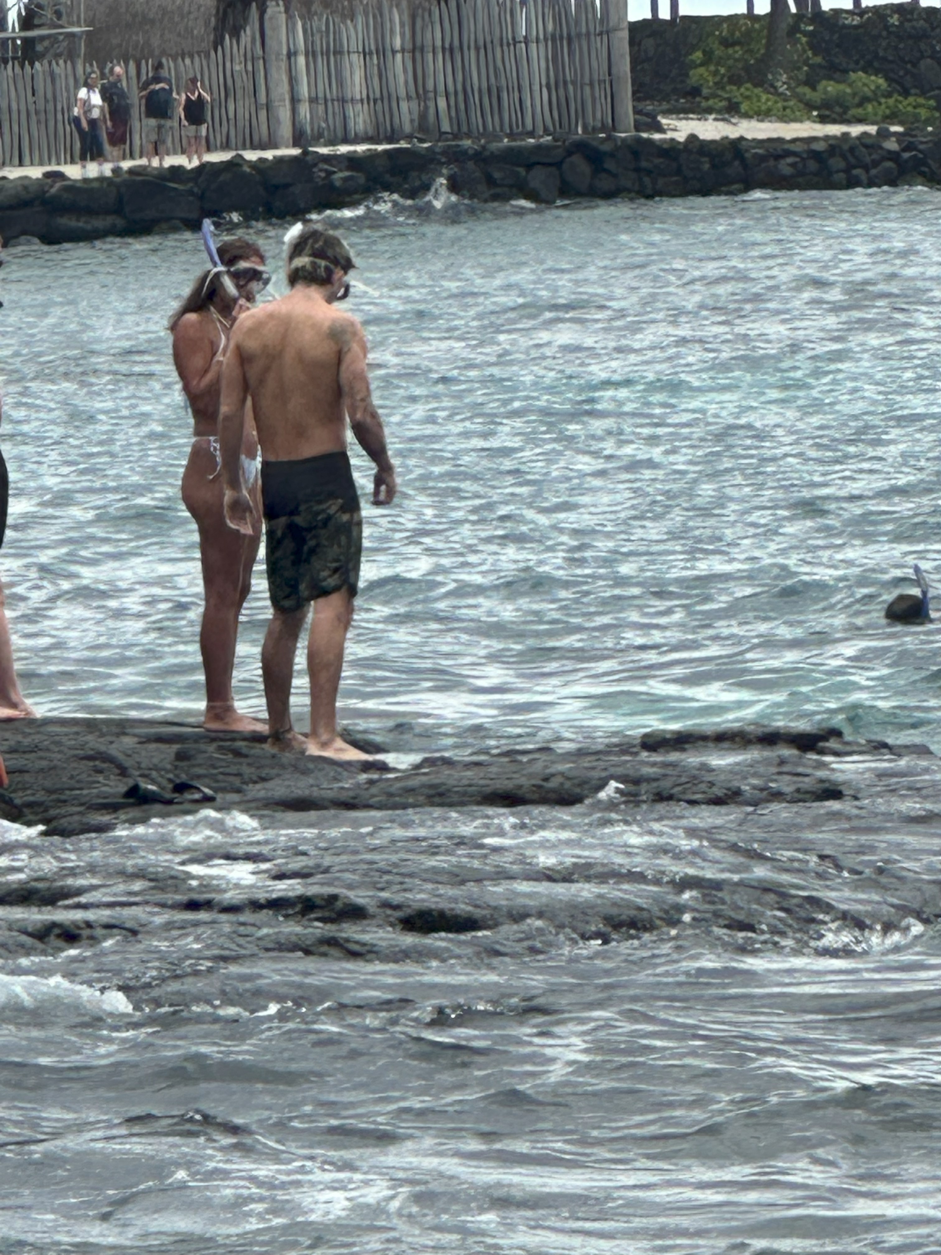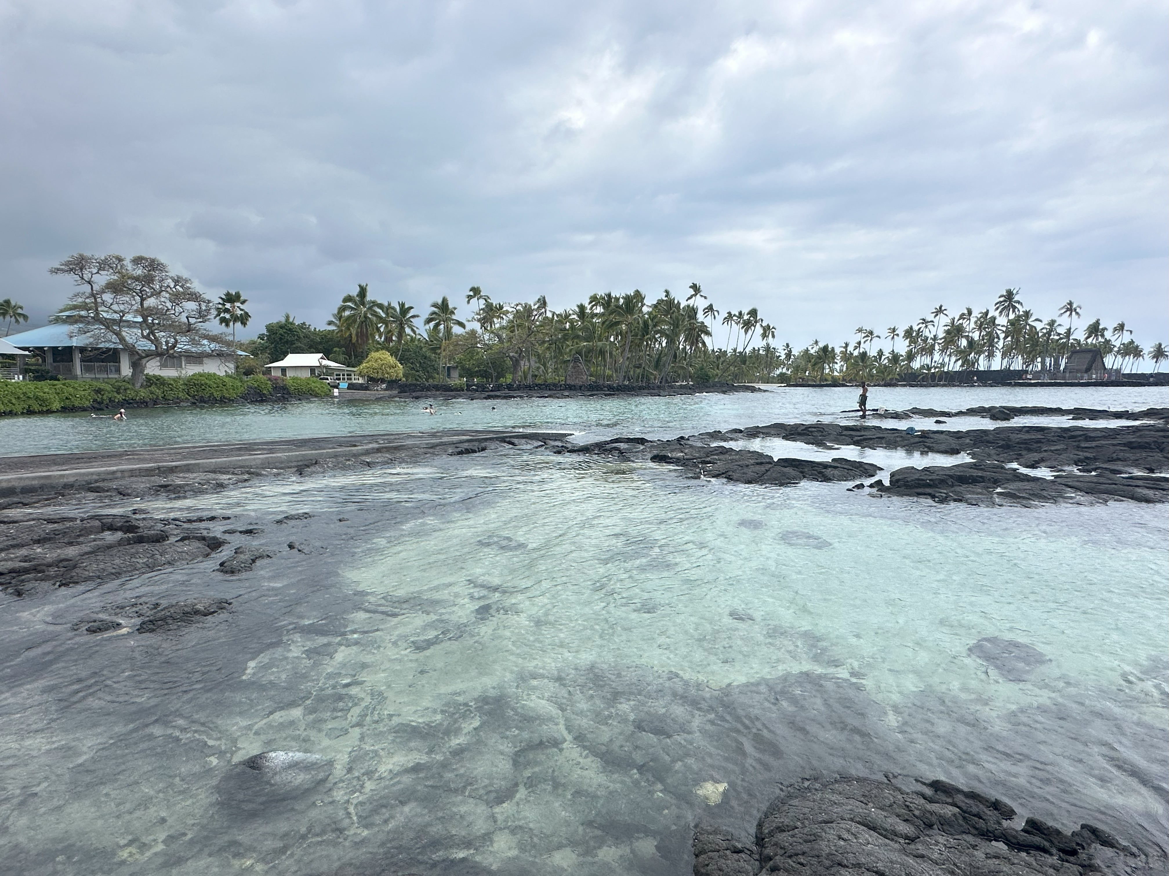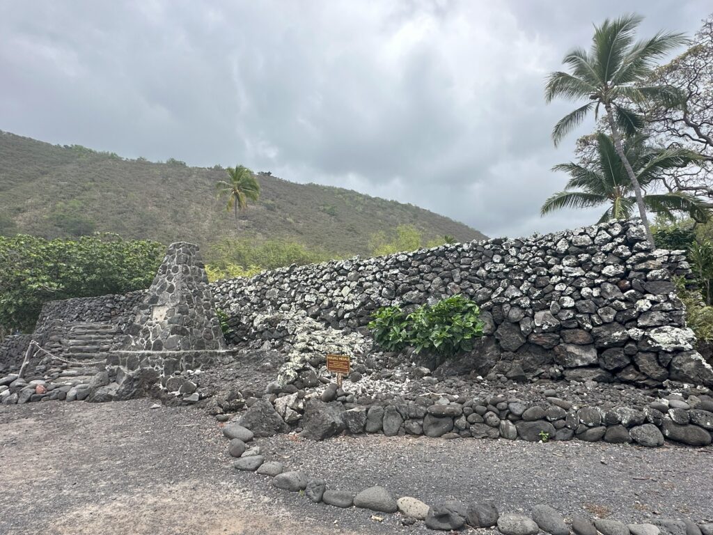 On our last day in Kona, we stopped at an excellent deli called Poi Dog (try it – you will not be disappointed) and then drove south to go snorkeling at Two Step. We first stopped at an historical within the Puʻuhonua o Hōnaunau National Historical Park, where we may or may not have heard the ghosts of ancient warriors . . .